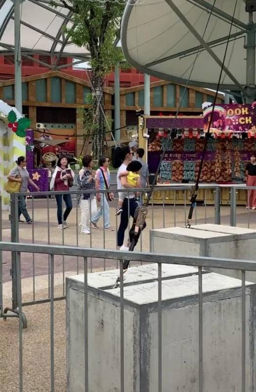 11月22日,有网友在新加坡偶遇张柏芝现身游乐场,从图中可以看到,张柏芝当天扎著高高的马尾辫,穿着白色T恤,搭配紧身牛仔裤,戴着墨镜,怀里抱着小儿子,Marcus戴着那个黑色的帽子,穿着黄色的衬衫,灰色裤子,张柏芝全程单手抱娃,十足的辣妈。
