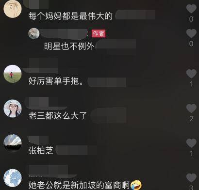 从评论区可以看到,当天偶遇张柏芝母子的网友说:“抱孩子的姿势是不是很霸气”,网友也都纷纷说:“这样抱孩子不累,走路也确实轻松”,“每个妈妈都是最伟大的,好厉害的单手抱”……如今拥有三个儿子的张柏芝,确实非常的幸福。