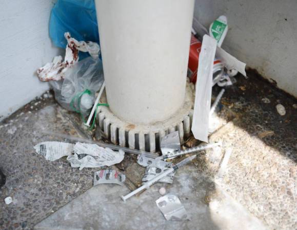 多层泊车场的楼梯间留下许多针筒和药丸,甚至还有沾血的纸巾。