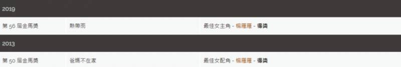 这是杨雁雁第二次在金马奖有所斩获,上一次是在2013年以新加坡电影《爸妈不在家》夺得“最佳女配角奖”,与《热带雨》一样,两部电影都是新加坡导演陈哲艺的作品。