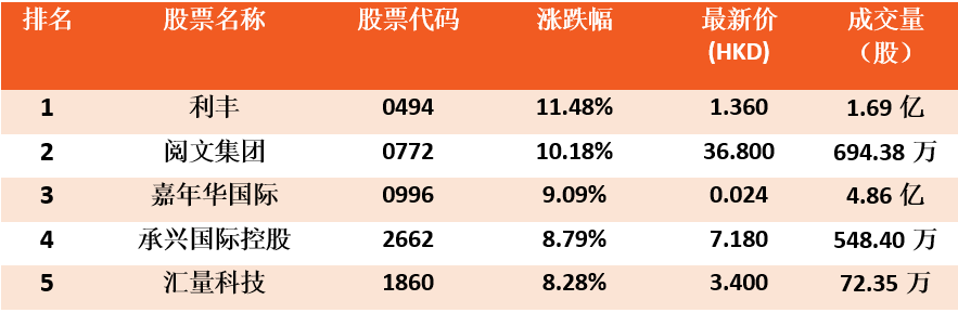 全天涨幅最大的5支港股通