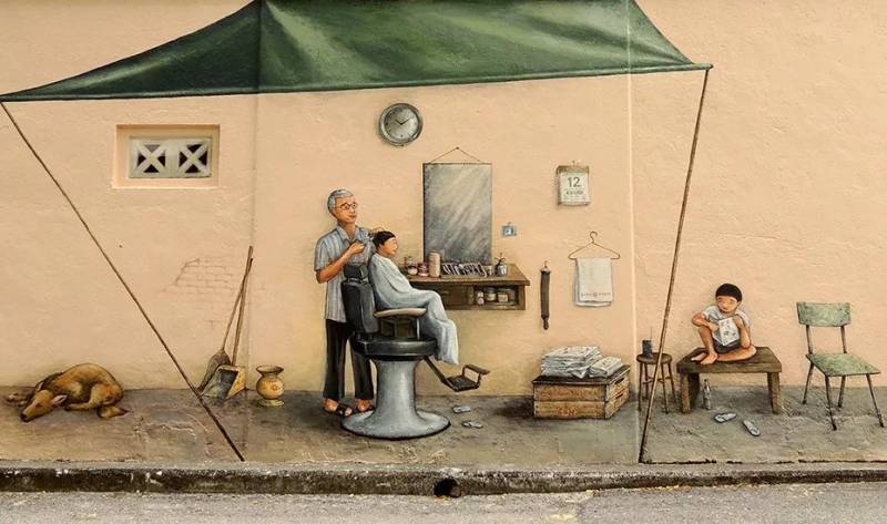 这副壁画绝对是对新加坡男生的童年回忆杀,到街角理发店修剪头上的三千丝烦恼,是每个男孩的成长记忆,昔日的简陋理发店,如今神奇的出现在小巷里,生动有趣的绘画,让人一秒回到小时候。