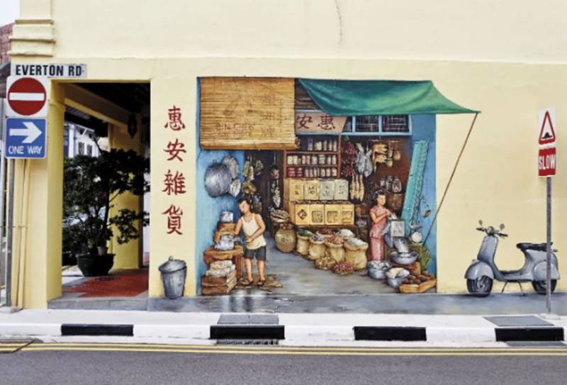 位于牛车水附近的艾弗顿园(Everton Park),距离新加坡濠景福朋喜来登酒店仅7分钟车程,这里有本土著名壁画艺术家叶耀宗的多幅作品,其中包括了让他声名大噪的第一幅作品: