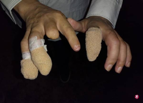 水泥板当场敲到葛坤银的头,他当场满脸浴血、颈椎骨裂,水泥板再压中双手拇指以外的八根手指,悉数骨折,右手中指折断。