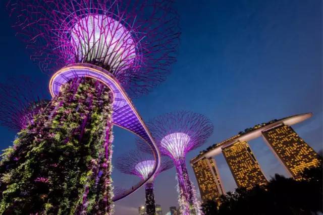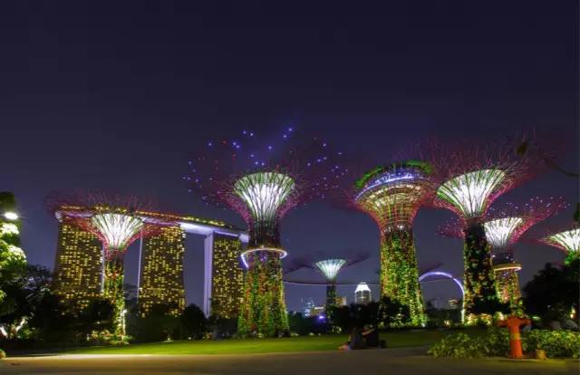 滨海湾南花园里竖立著18棵擎天大树,造型怪异。当太阳落下,这些犹如阿凡达的精灵树会散发出神秘的光芒。当地人常常在下班后邀上几个好友或者带着家庭成员,来这里悠闲散步看夜景。