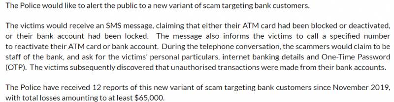 昨天(11月25日)晚上7点半,新加坡警察部队(简称SPF)发布公告,称新加坡出现了一种冒充银行的新型诈骗手法,能够通过套取用户个人资料进行非授权交易。