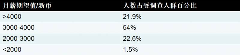 根据奖学金咨询网站BrightSparks的调查,有54%的新加坡学生期望自己进入工作岗位后的每月薪水在3000-4000新币之间。