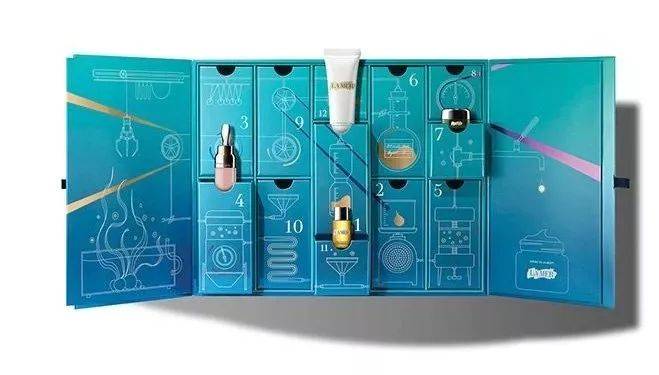 LAMER家今年真的超好看~外壳的蓝色是渐变的,从蓝到绿。里面的护肤系列也是经典的一套。每个小格子里面包装纸是金色的,让人都舍不得拆开!