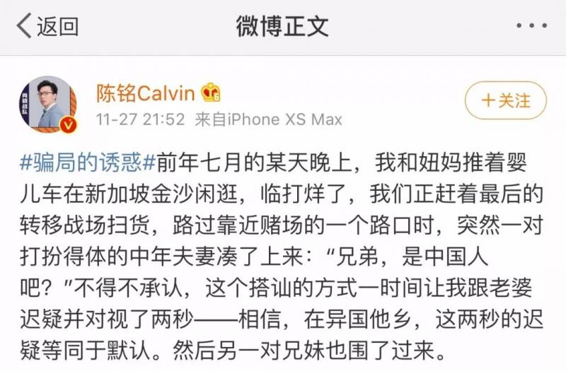 辩论类网红节目《奇葩说》上届冠军得主陈铭日前在微博发文称,疑似在新加坡金沙赌场门口遭遇骗局。