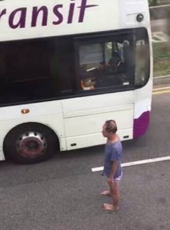 视频显示,身穿短裤和T恤的男子当时赤脚,在马路中央徘徊,车辆和巴士纷纷放慢速度绕过他。