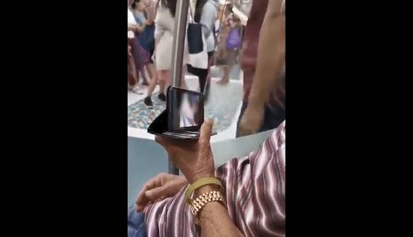 今天Twitter上流传了一个超辣眼睛的视频。一位戴着金表满头白发的安哥,竟公然在人来人往的地铁上看黄片!