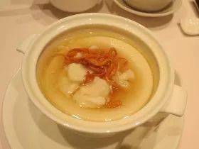 最受欢迎的是龙虾虫草花芙蓉清鸡汤,它还不是纯粹的炖汤,用汤匙舀一舀,碗内是一层有如豆腐一样蛋白!