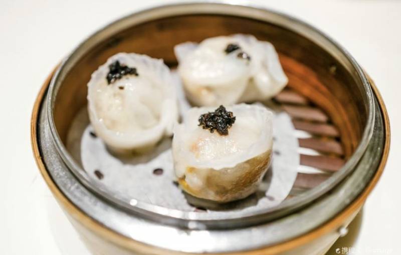 点心方面,在传统点心里注入鱼子、松露等不同味道。最左边的香辣煎包是潮州煎包的做法,猪肉馅料里加入老干妈酱增添香辣味道;鱼子鲮鱼烧卖在鱼肉烧卖上搭配着avruga顶级鱼子;金钱韭菜明虾伴黑松露沙拉酱,蘸着黑松露酱提升香味。
