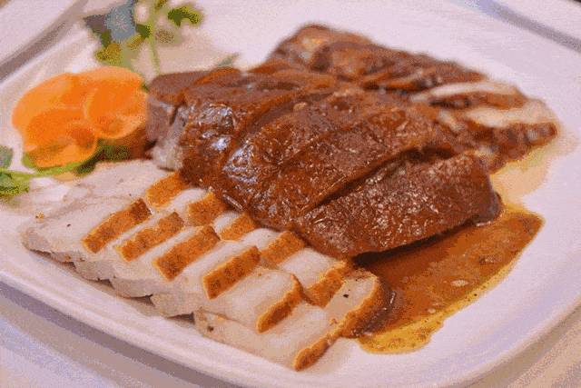 这家的招牌菜之一是五彩脆皮烤鸭,很多人会问,烤鸭不是北京的吗,但传统粤菜其实含有了京区的菜肴特征。鲜嫩爽口的广式烤鸭搭配上五种饼皮和五种特色酱汁,是绝佳的口感碰撞。