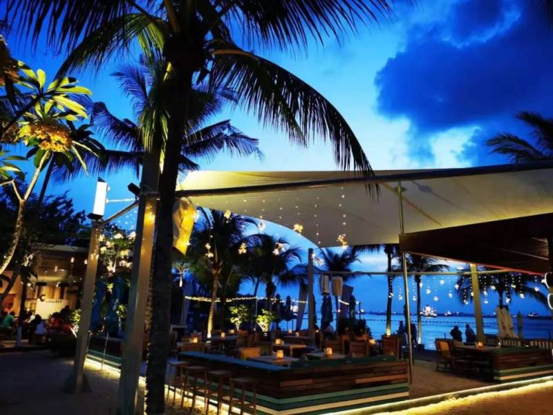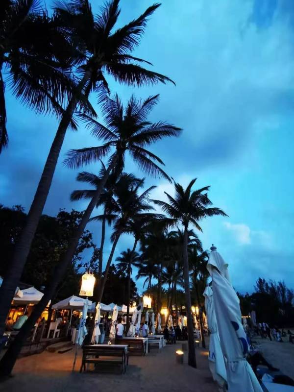 到了晚上餐厅和躺椅的灯都亮了,天空特别蓝,黄昏的光线一点点暗下来。