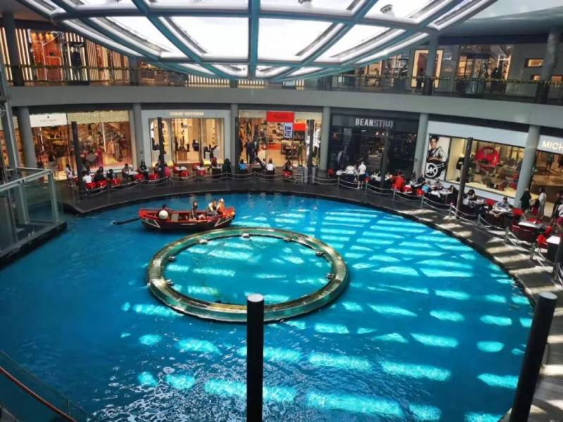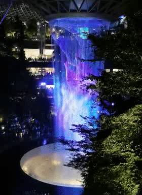 白天里四周环绕的绿植仿佛置身森林公园,夜晚绿植浸入黑暗中,瀑布的灯光变成一道神奇的漩涡。整点的灯光秀值得一看。