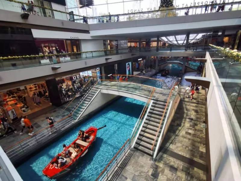 从Marina Bay站下车以后,会先经过滨海湾金沙购物商场。商场里有一条像威尼斯的人造小河。太阳穿过透明的穹顶打在碧蓝色的水池上,美得晶莹剔透。