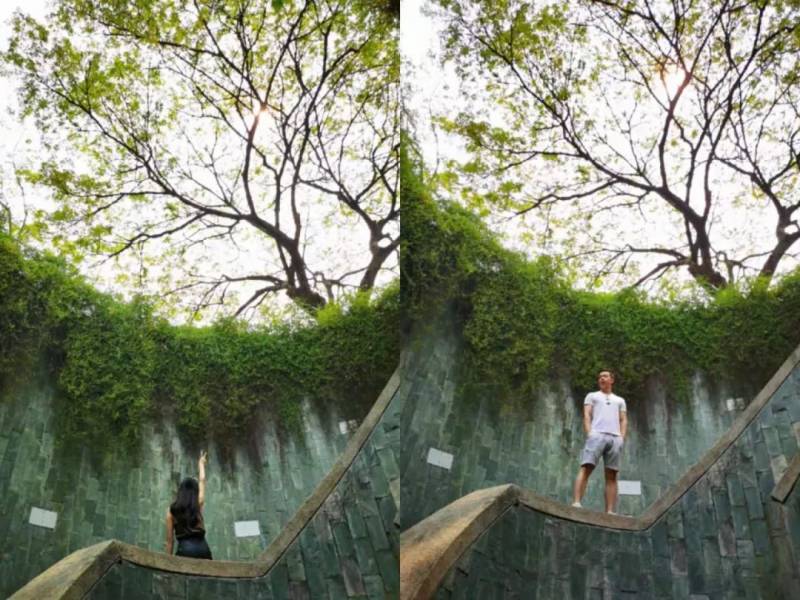 顺着林廊和台阶可以走进瀑布森林山里,站在高处的空隙窗口,很像是童话故事里被困在奇妙城堡窗口等待营救的丛林小仙子。