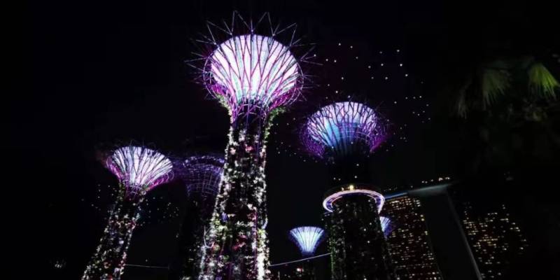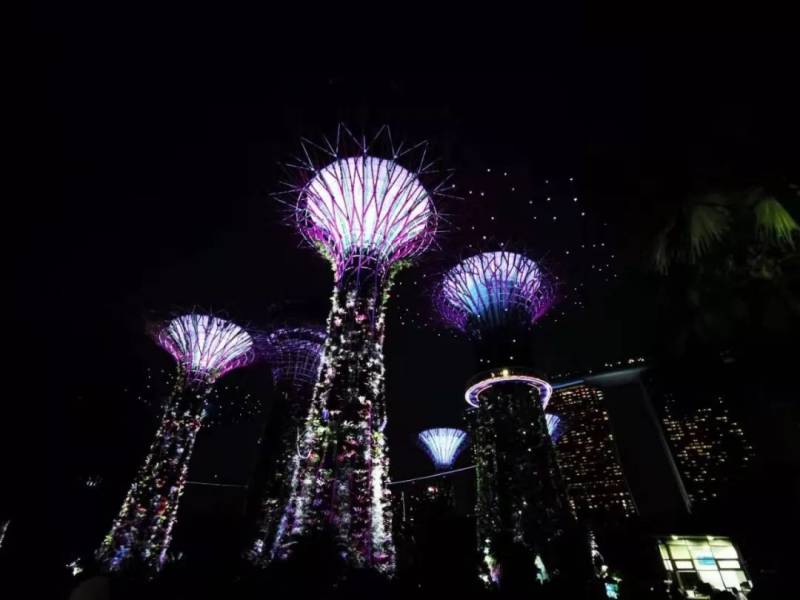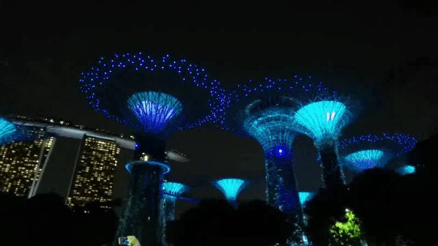 所有人都围坐在超级树下面的草坪和台阶上,像在等待一场大型live show。其实也可以称得上是live show吧,在古典圆舞曲的伴奏下,灯光随着旋律起舞。