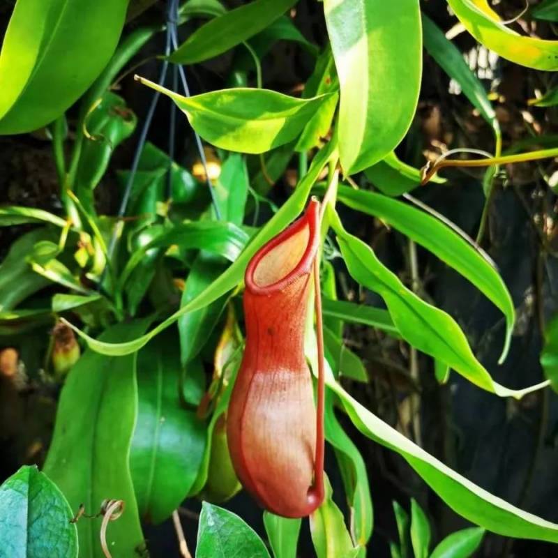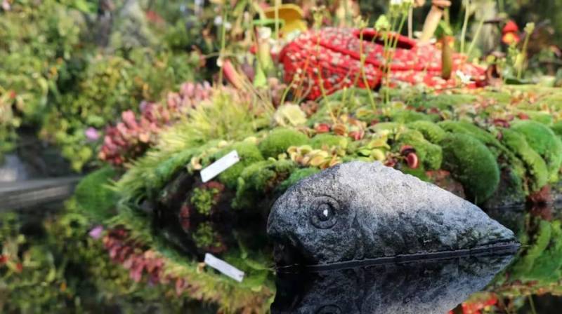 二楼的植物景观像极了小时候看的动画片里的奇异王国。各种食虫花一样的植物茂盛生长。就连池塘里的石雕也是逼真的鱼的形状,像一条鱼化石。
