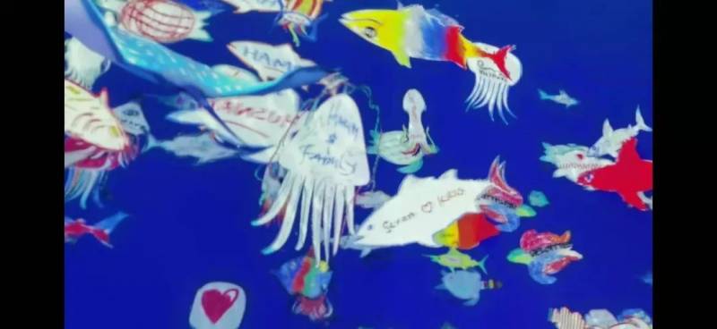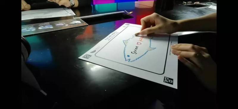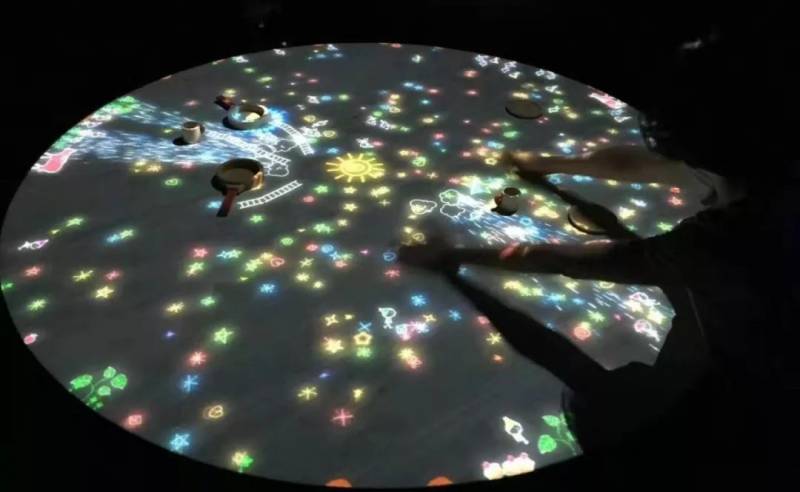 Teamlab的展很适合对小孩子的启蒙。其中有一个环节是可以在纸上随意涂鸦,然后通过一个投射器,就能出现在大屏上,对小孩子,也甚至是大人都是很有意思的一个创意。