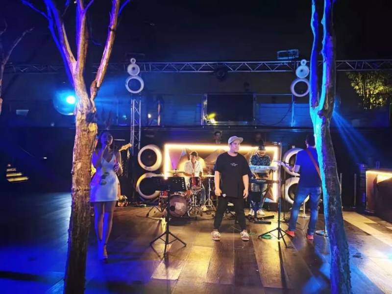 酒吧有一层半,最上面一层是360的环形观景台和DJ角,下半层阶梯,是乐队舞台和舞池。