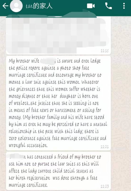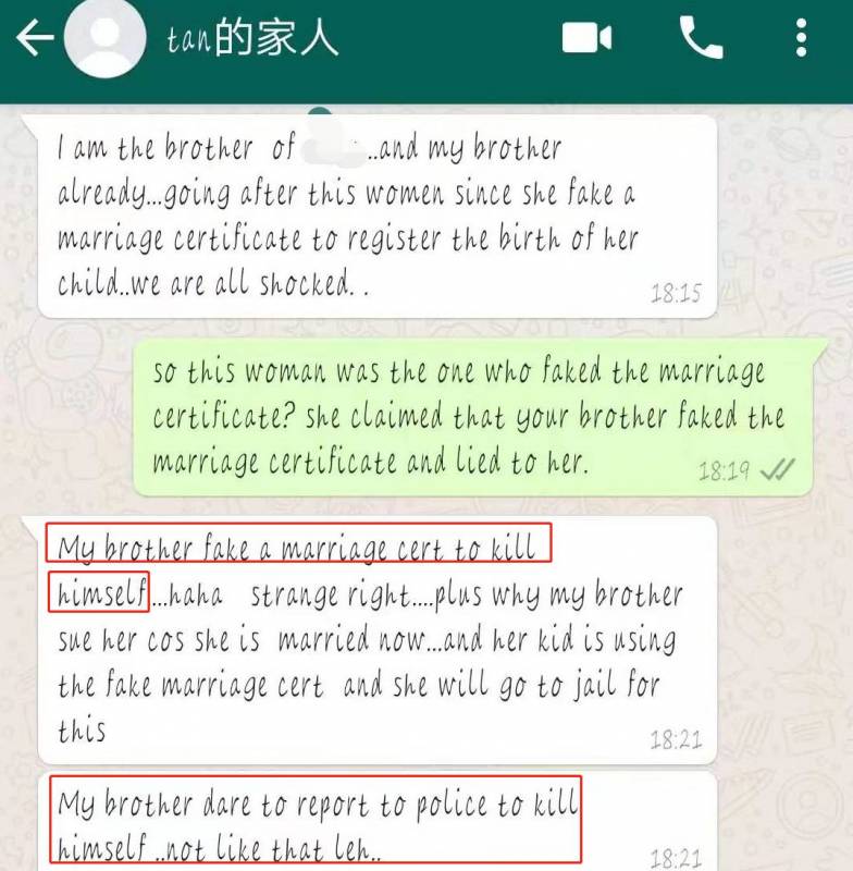 同时,Tan的哥哥也说,小芳曾经联系过Tan的朋友,让他们不要就假结婚证一事提起诉讼,不然可能影响孩子的身份。对此,小芳表示否认,说联系Tan朋友一事是“根本没有的事”。