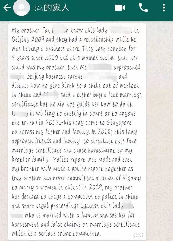 Tan的哥哥说,即使Tan确实在婚内和小芳有过一段情,但Tan全家人在面对错误指控时都不会容忍。不管小芳之前遭受了多少困难和不幸,这都不是她散播错误信息、骚扰Tan一家人以及要求金钱的理由。(Tan的家人似乎不认为小芳的孩子是Tan的)