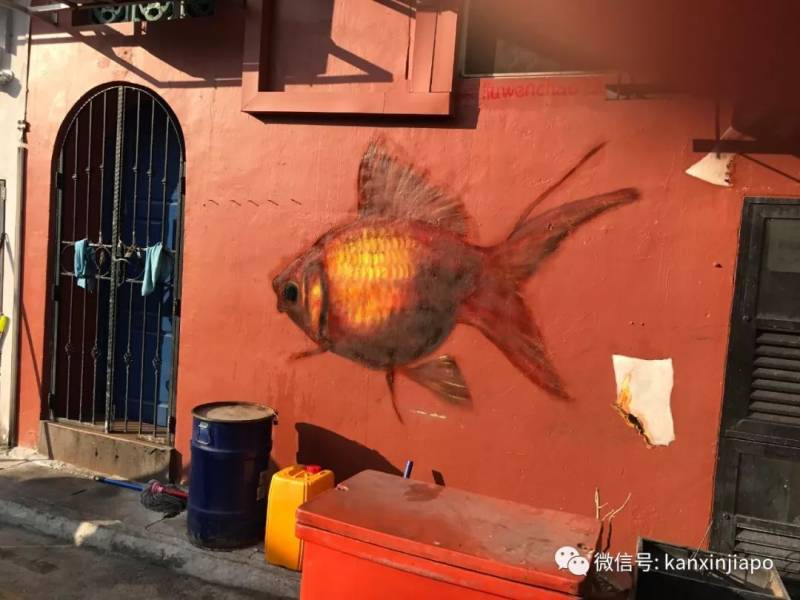 漫步在甘榜格南的小巷里,墙上的鱼正映着阳光,反射在画中的鱼鳞上。