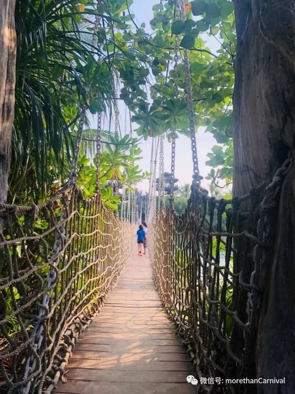 吊桥的入口很隐秘,在两棵巨大的树之间。来这里游玩的人,除了晒日光浴,都会来吊桥上走一走,回味儿时在蹦蹦床上身不由己的感觉。