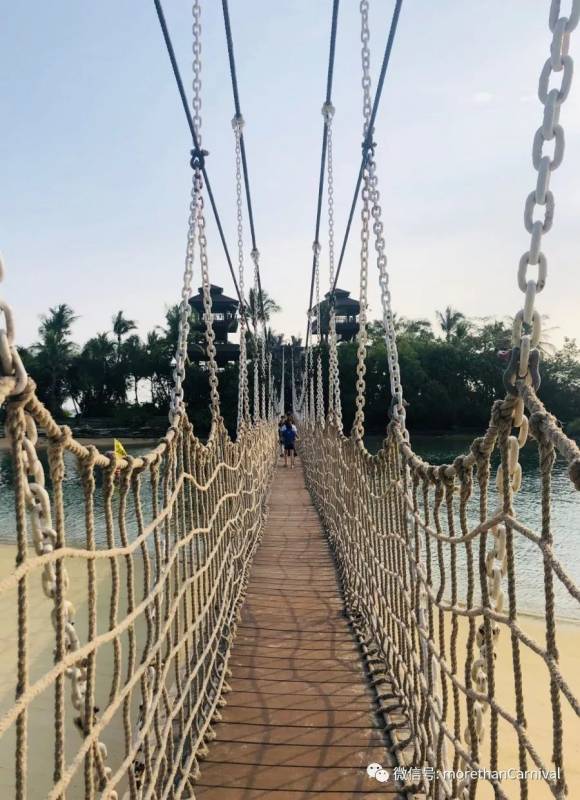 一座悬索吊桥跨过浅浅的海湾,吊桥很窄,也很晃。