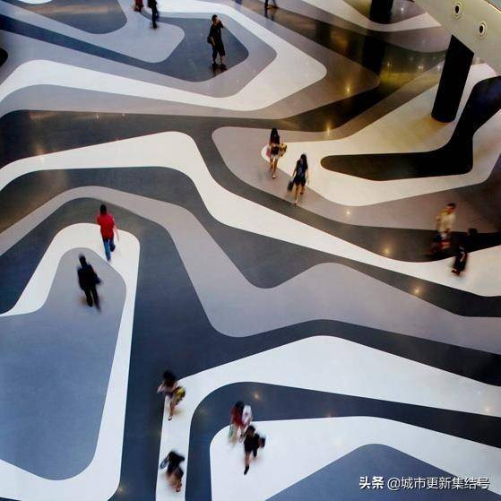 所有通道都通向主厅,主厅是一个高40m 的中庭,自动扶梯、电梯和每层格局的错落,最大化地避免视觉盲点。虽然在水平方向被分割成上下两个体量,但是每个体量都有各自的特色,并且从视觉上看是相互关联的。动感的黑白灰色块形成的图案使内部充满动感、时尚气息,又将整个建筑从内之外的空间与整体环境形成交流。