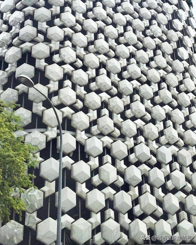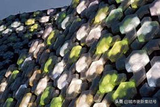 (2)采用宝石聚碳酸酯材料打造的水晶网媒体墙立面,它由像宝石似的小固著物组成,将节能灯泡置入定制设计的反射镜,由软件控制,水晶媒体墙立面被建筑师处理成堆叠的,波浪起伏的条带,或重叠,或退让;而空隙空间形成悬伸的花园和露台。