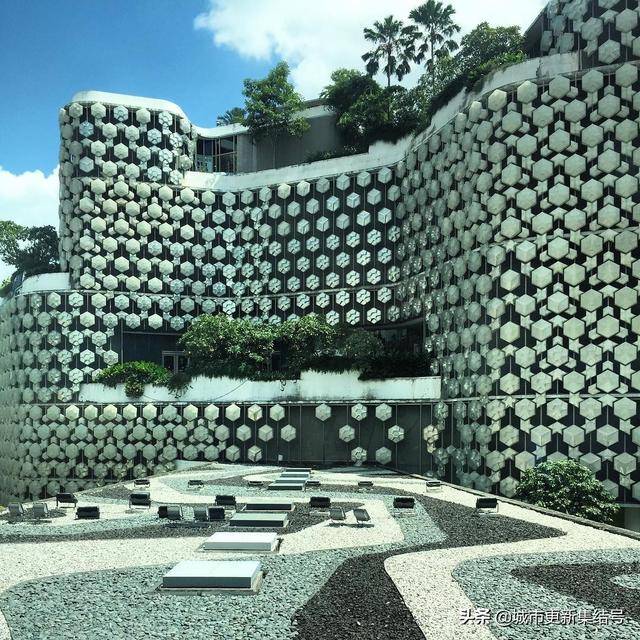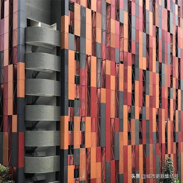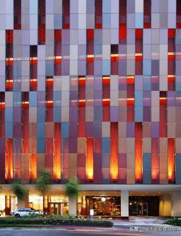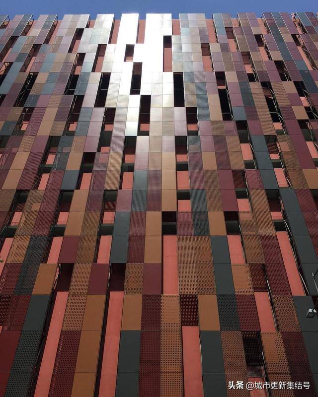 (2)采用钢架固定的多孔铝合金板,明亮的颜色与中空的体块错落的阴影,在表面形成明亮的柔和的光影交错,令人感到快乐和舒适