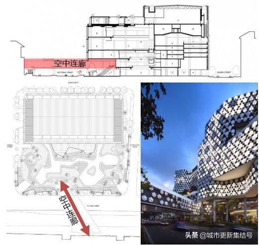 建筑第二层设置一座人行天桥跨越道路,与对面的商业项目Bugis Junction间建立一条通道,导入聚集更多客流,同时填补Bugis Junction在娱乐体验上的缺失。