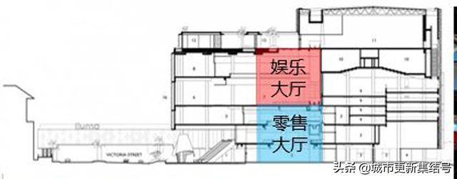 下层大厅主要用于小规模的专卖零售,而上层大厅则用于各种娱乐活动。分割两个空间的是一个城市广场,高出街道20m,上面有酒吧,游戏,电影院和餐厅。