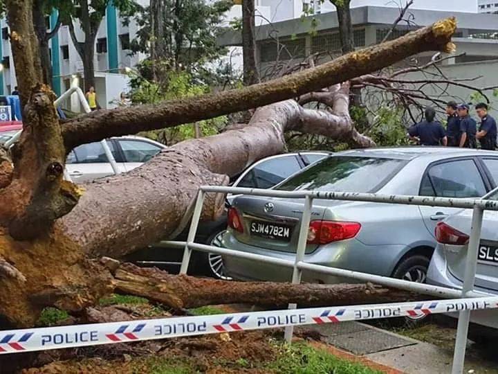 前天下午(12月2日)暴雨和强风席卷了新加坡全岛,多地发生积水。傍晚时分,勿洛一棵15米大树倒下,砸中一辆黑色奔驰轿车。