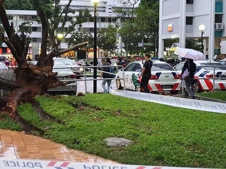 从这张在脸书上流传的照片可以看出,破坏力惊人的大树将黑色奔驰车的车顶砸穿,还将旁边牢固的铁栏杆连根砸起。大树倒塌的位置就在人群密集的组屋不远处,据称,当时奔驰车主正在旁边店铺喝咖啡,幸免于难。此次事件中并无人员伤亡。