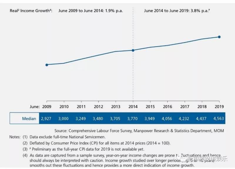 包括雇主公积金缴交率在内的员工实际收入也有所增长,工资中位数增至4563元,增长率为2.2%,相比去年的4.4%增长率减少一半,但2014年至2019年这五年的实际收入中位数年增3.8%,相比之前五年(1.90),显著提高。