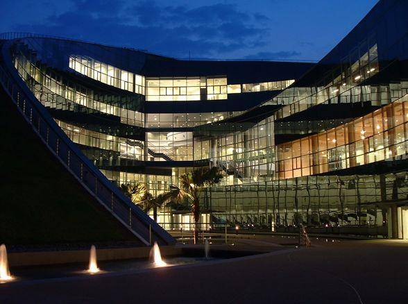 外墙采用流线型的蓝绿色玻璃设计