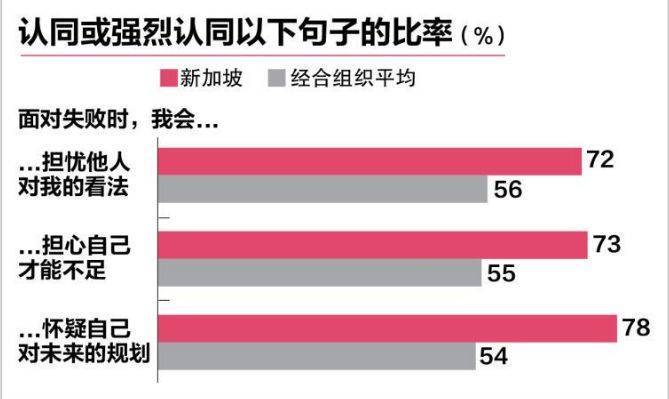 在面临失败时,72%的学生会担忧别人的眼光;78%会怀疑能否落实自己对未来的计划;而经合组织平均比率分别为56%和54%。