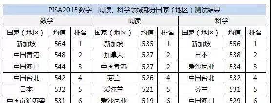 2015年排名:新加坡数学、阅读、科学均排名第一。
