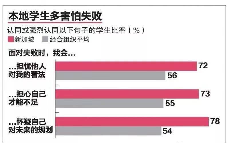 新加坡学生对失败的恐惧也更大。最新的国际学生评估项目显示,有72%的学生会担心别人的眼光、怀疑自己的才能,78%甚至会质疑自己对未来的规划。