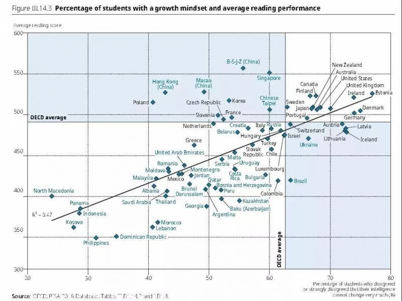 统计数据也显示出,新加坡持有成长心态的学生更有学习动力、自我效能感和学习目标的比重还是不错的。在PISA测试中的阅读能力表现中,持有成长心态的比例与阅读表现呈现出正向关系。