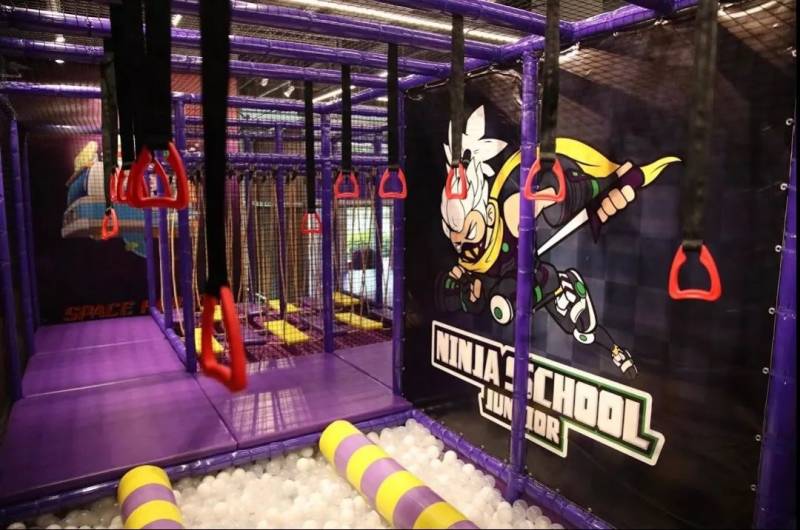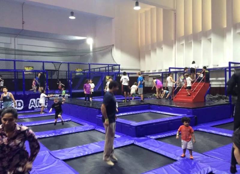蹦床乐园通常都设有多样化的玩乐设施,比如让孩子们在蹦床上玩躲避球、灌篮或攀墙等。