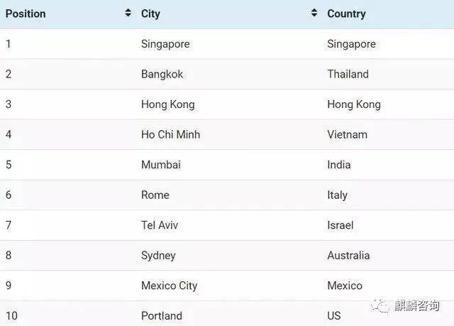 新加坡位于榜首,其次分别是曼谷、香港等。