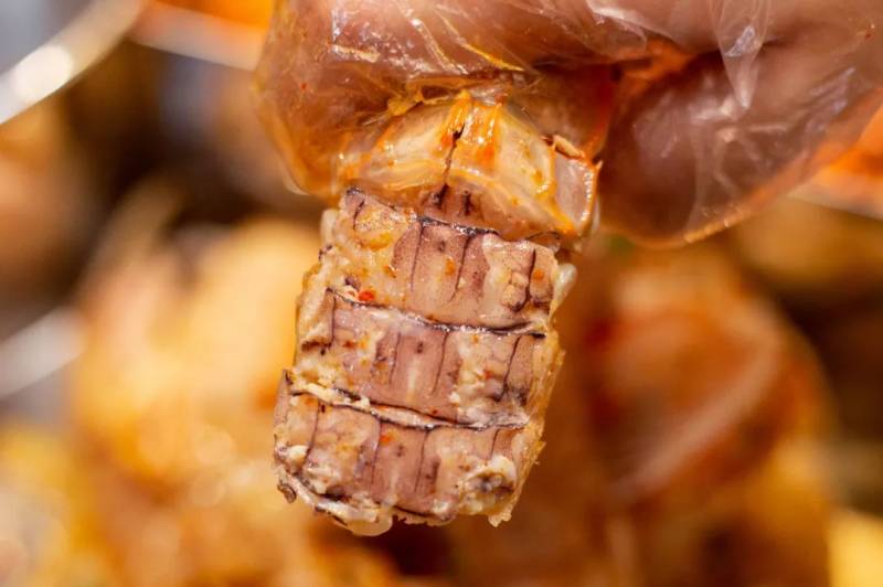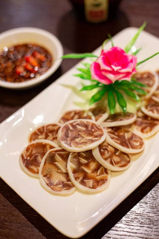 猪耳朵经过酱制之后,再灌到鱿鱼肚里,继续蒸