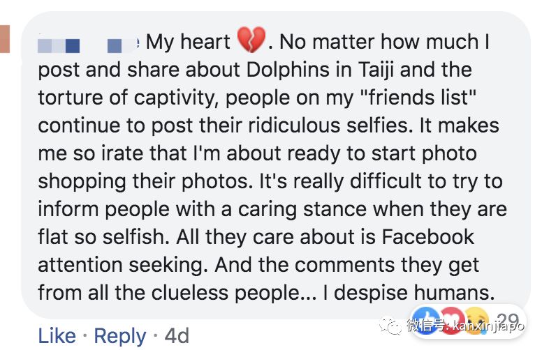 “我的心都碎了。不管我发表多少关于海豚被囚禁和折磨的帖子,我的朋友圈还不断有人发他们和海豚的自拍照。这让我非常生气。他们自私地只想要在社交媒体上得到关注,不顾及这些无辜的生命。我鄙视人类。”
