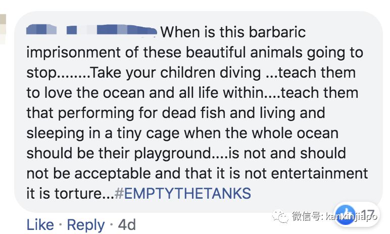 “什么时候囚禁这些美丽的动物才能停止......带您的孩子去潜水,教他们热爱海洋和海洋里的生命。告诉他们这些生物应该在海洋里畅游,而不是被关在小小的笼子里被人类当成消遣娱乐。”