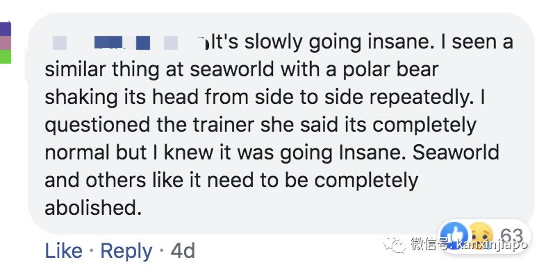 “它已经慢慢地发疯了。我在海洋世界看过类似情况。一只北极熊不停地左右摇头。我问北极熊的驯养员,她说这完全正常,但我知道它已经发疯了。海洋世界和其他类似的景点需要彻底被废除。”